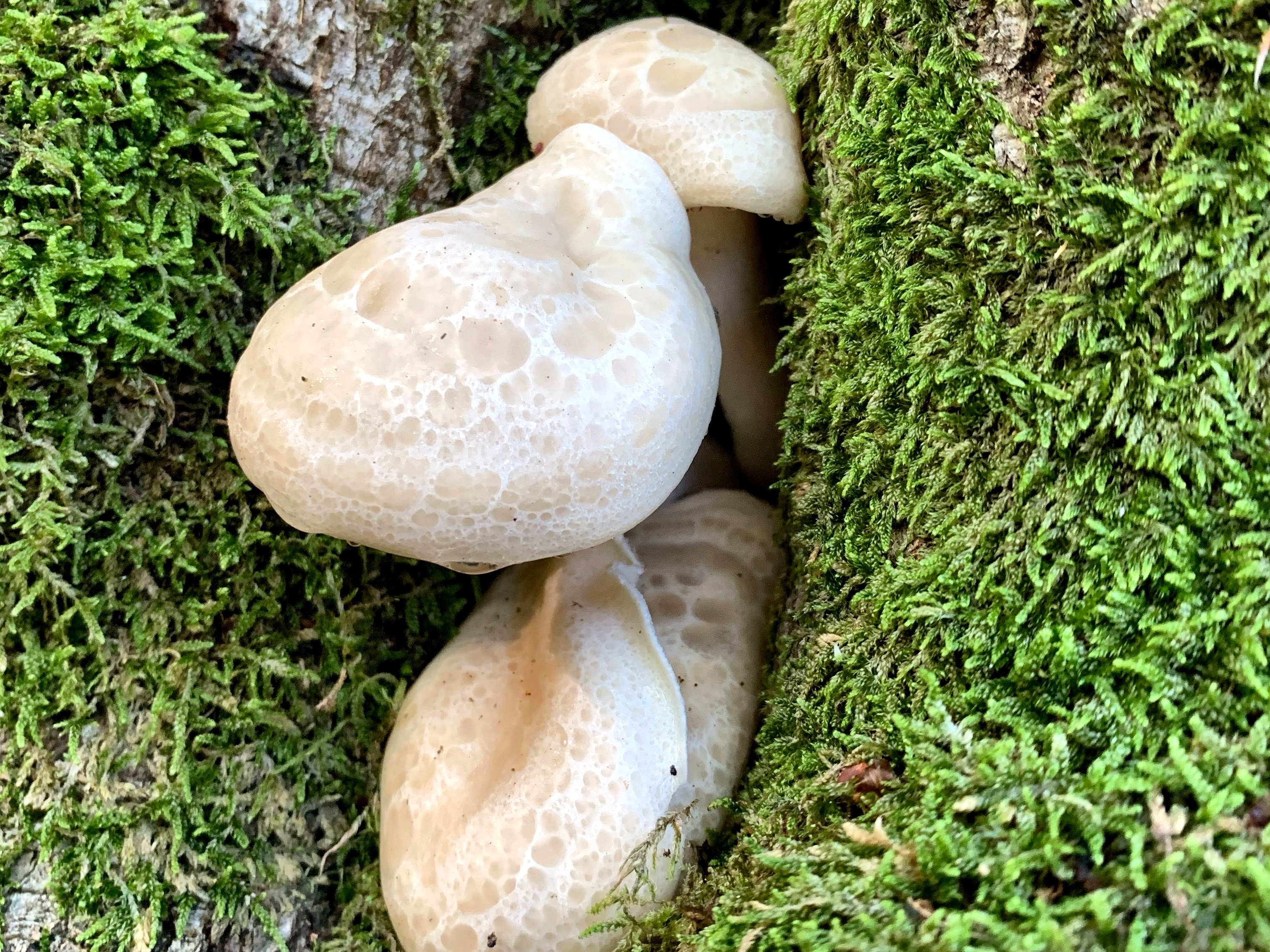 Пластинки: Частые, белые или желтоватые. Главное отличие от вешенки (Pleurotus) — они не нисходят на ножку или нисходят лишь слегка.