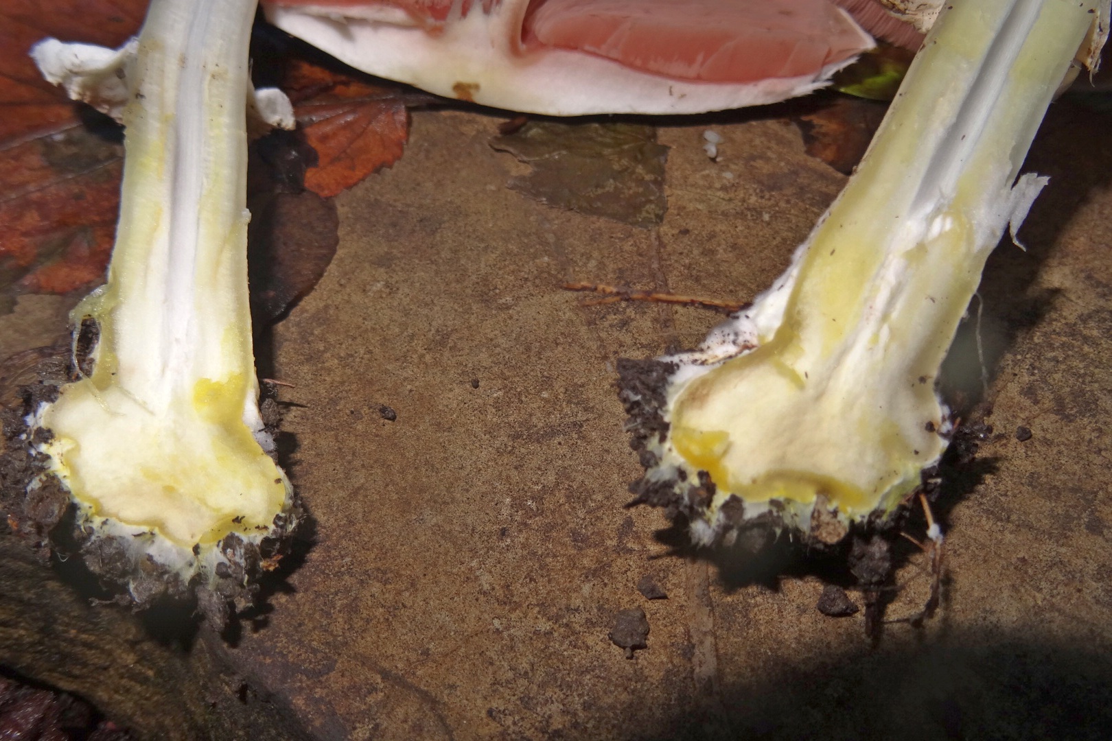 Мякоть белая, на изломе в основании ножки становится желтой, с неприятным запахом, напоминающим запах фенола.