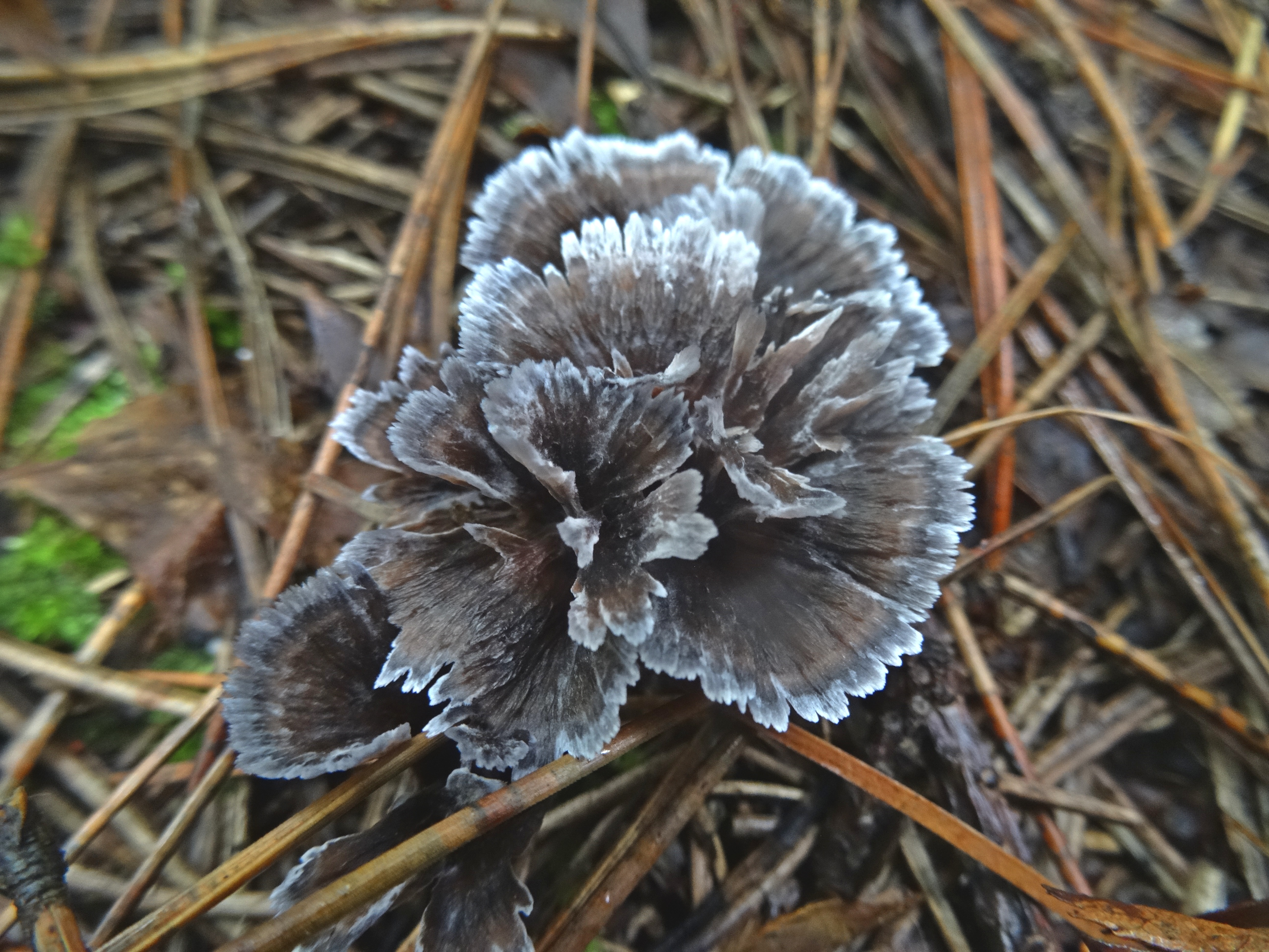 Встретил как-то этот грибок - сразу подумал что на цветочек похож, раньше видимо молодым на глаза не попадался поэтому не обращал внимания, на сайте http://macroclub.ru мне его определили как телефору гвоздичную.